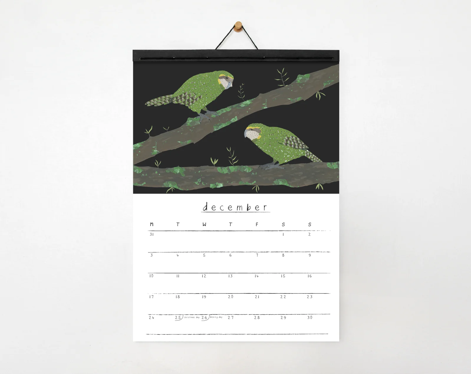 Introducing the second of my 2018 calendars, a colourful smaller calendar specifically designed so that I can offer a cheaper shipping option for both my local and overseas customers. They also make great Christmas presents because they're unique and practical (with room for writing). This colour design focuses on 12 of the rarest bird species of NZ, particularly chosen to include some popular birds as well as some lesser known birds that more people should know about! These A4 calendars are beautifully printed with matte inks on 100% recycled paper with tear off pages, and are hand bound with a unique binding method that I devised myself using only paper and cotton twine. I can't stand the thought of anything I create having a negative effect on the environment and I worry about all the wire hangers that most calendars are bound with piling up in the landfills. So here's my alternative. Just paper, twine and a whole lot of time!